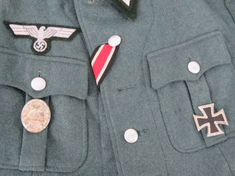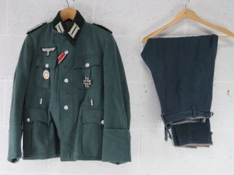 A reproduction German Combat Jacket with Insignia, and breeches.