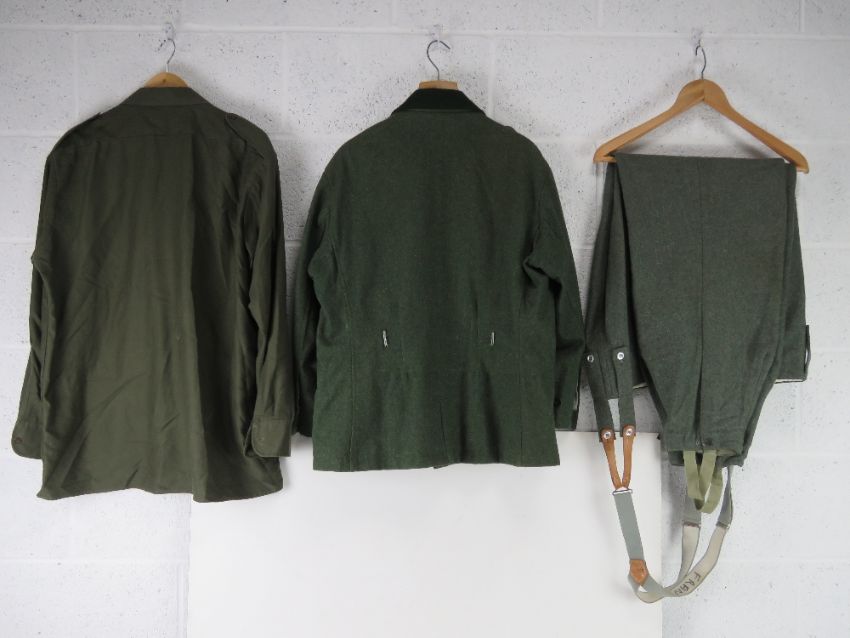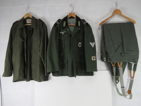 Repro uniform; a German combat Jacket with insignia, size 44 together with a German combat shirt size 46 and trousers with braces.