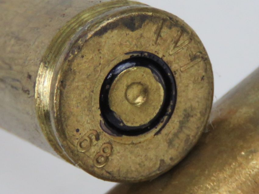 An M1 garand clip containing eight inert rounds. Bullets approx 8.5cm in length.