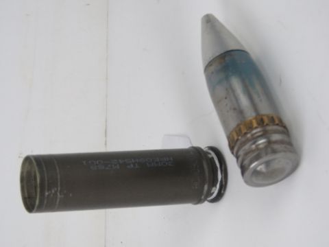 An inert 30mm TP M788 cannon round, 20cm in length.