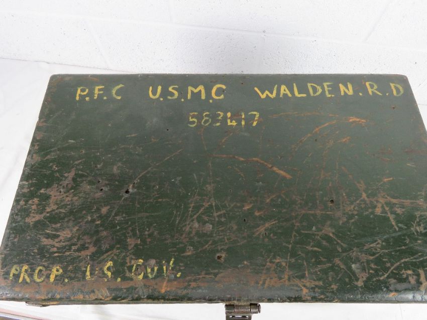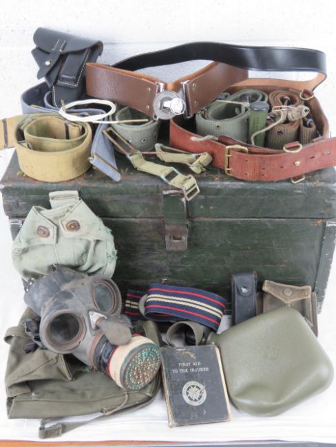 A wooden US Marine chest having a quantity of gas masks in case, webbing belts, holster, water bottle etc.