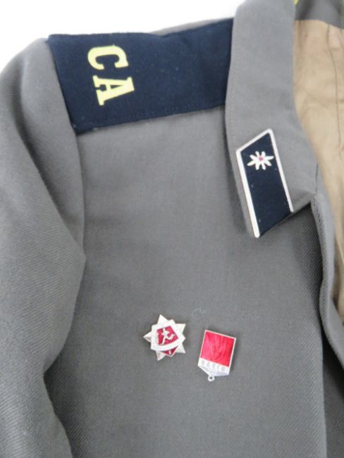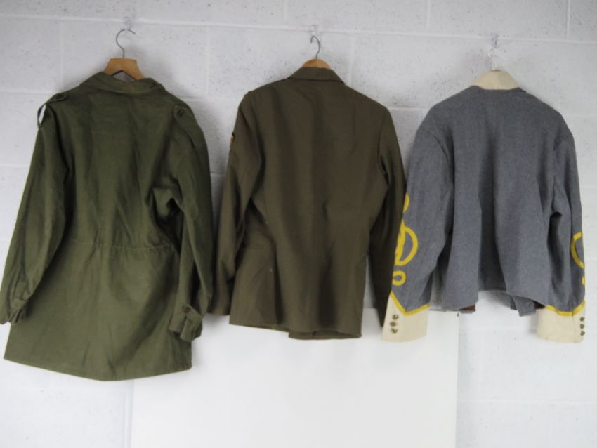A Dutch combat jacket, a USSR tunic with insignia, a repro US Confederate Civil War General Tunic and a Field Pack canvas bag.