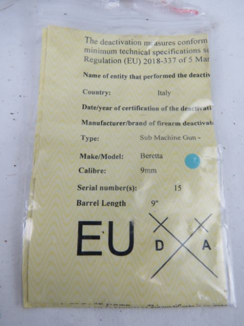 A deactivated Beretta M38/44 SMG. Grooved Barrel SN 15. plus accessories.