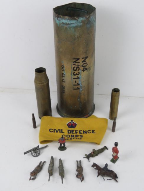A Civil Defence Corp Rescue arm band, together with a quantity of lead painted Army figurines a/f, a 1943 20mm inert brass shell, a 30mm inert brass shell and a 105mm inert brass shell.