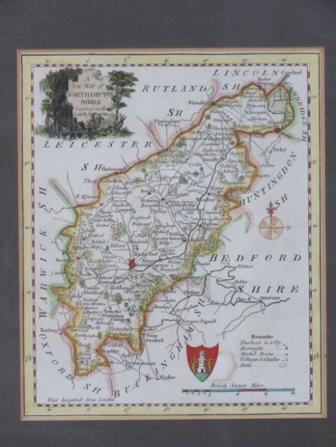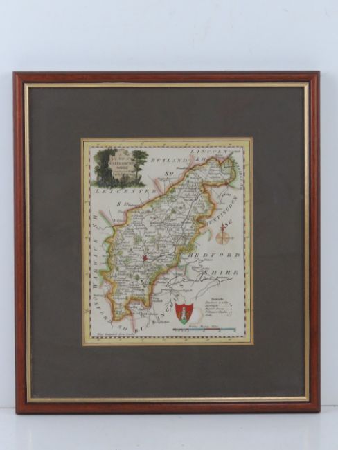 Northamptonshire, a hand coloured map, sight size 16 x 20cm framed and glazed.