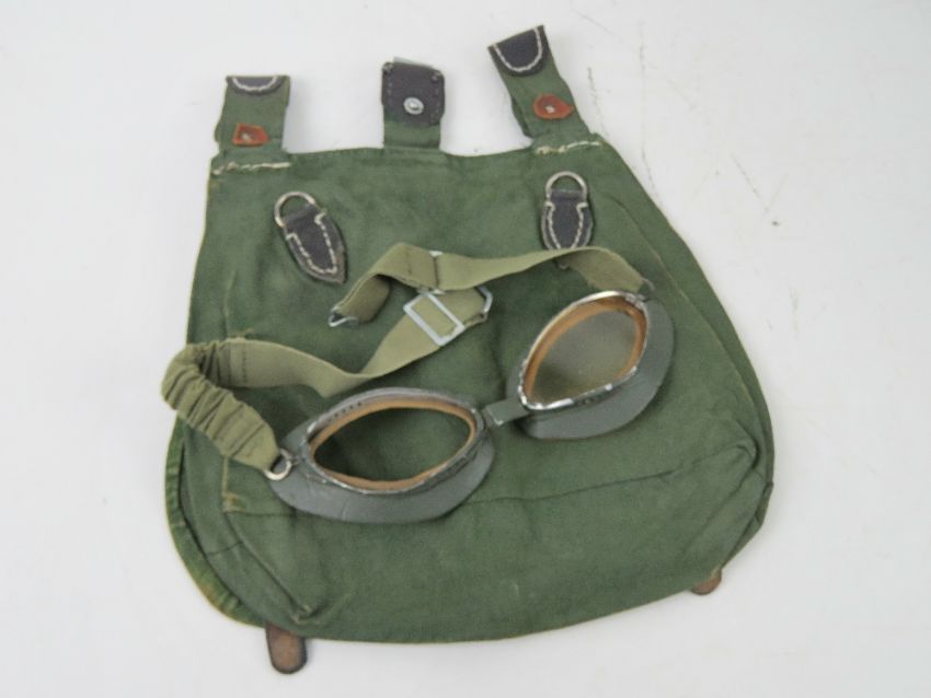 A quantity of reproduction German military items inc; helmet, bread bags, gas mask, filter gas mask tin and straps and a pair of field goggles, one lens a/f.