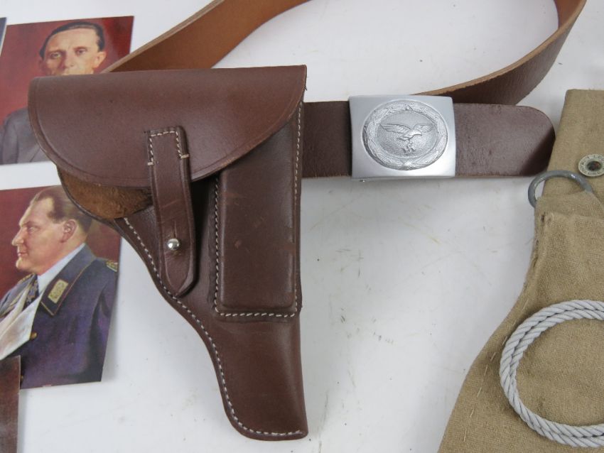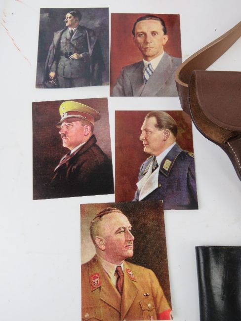 A quantity of assorted military themed and reproduction military items; 15x German WWII music cassettes.1x Walther PPK holster, belt, Luftwaffe belt buckle and magazine. 5x German Colour postcards (1x Dr Ley, 1x Goebbels, 2x Hitler, 1x Goring) size5 ½ x 4 ¼ inches. 1x German breadbag. 1x German visor cap chinstrap. 1x pair German leather gaiters. 4x assorted German insignia. 1x German sticker.