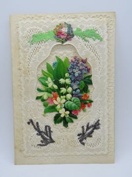 A decoupage Sweetheart or Valentines card, having central bouquet including Lily of the Valley and Forget-Me-Not on paperlace, no message within, approx 12.5 x 9cm.