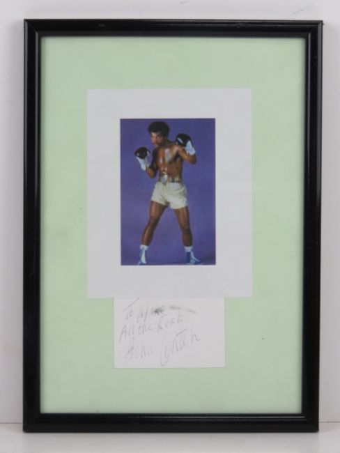 Autograph; hand signed slip 'To Mike All the Best John Conteh' (John Anthony Conteh, MBE is a British former professional boxer who competed from 1971 to 1980. He held the WBC light-heavyweight title from 1974 to 1978, and regionally the European, British and Commonwealth titles between 1973 and 1974.) With photographic print over in plasticised frame measuring 31.5 x 23cm.