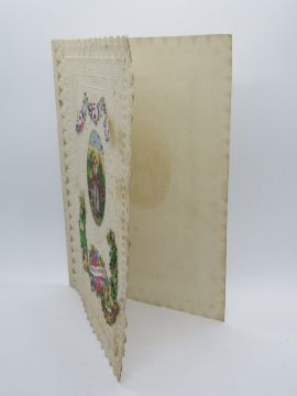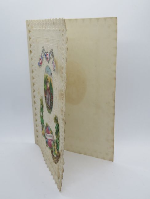 A decoupage Sweetheart or Valentines card, central couple in garden scene over paperlace and applied floral garland, entitled 'With Kind Remembrance', no message within, approx 14 x 10cm.