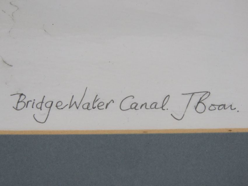 A watercolour and ink sketch of Bridgewater Canal signed J Boon, sight size 38 x 26.5cm, framed and mounted.