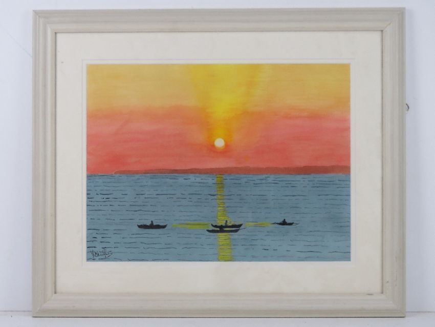 Frank Watkins; Watercolour 'Embaraduro' being a sunset scene with fishing boats upon water with land to background, sight size 40 x 30cm framed and mounted.