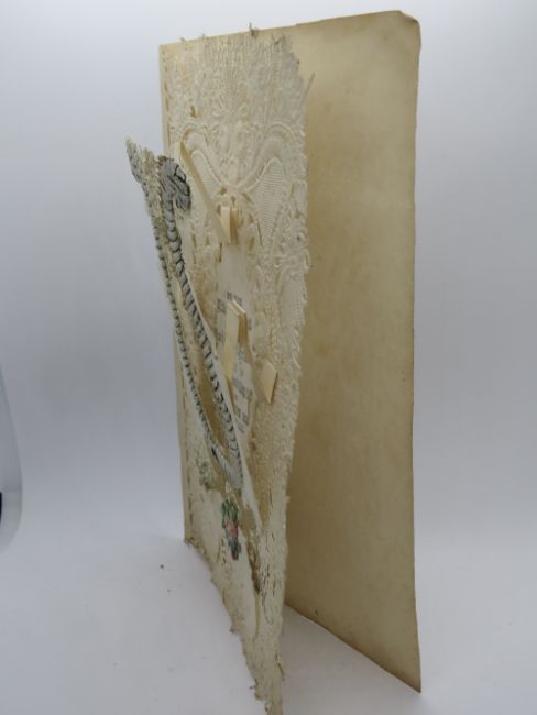 A decoupage Sweetheart or Valentines card having central Lyre design over paperlace 'I do this little present send unto my much beloved friend it doth of love & friendship (?) to one who knows me long & well', no message within, approx 18 x 12cm.