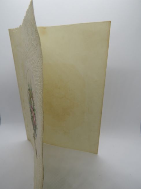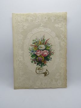 A decoupage Sweetheart or Valentines card, having paperlace border and central floral bouquet motif entitled 'Take Pity On Me', no message within, approx 13.5 x 10cm.