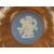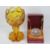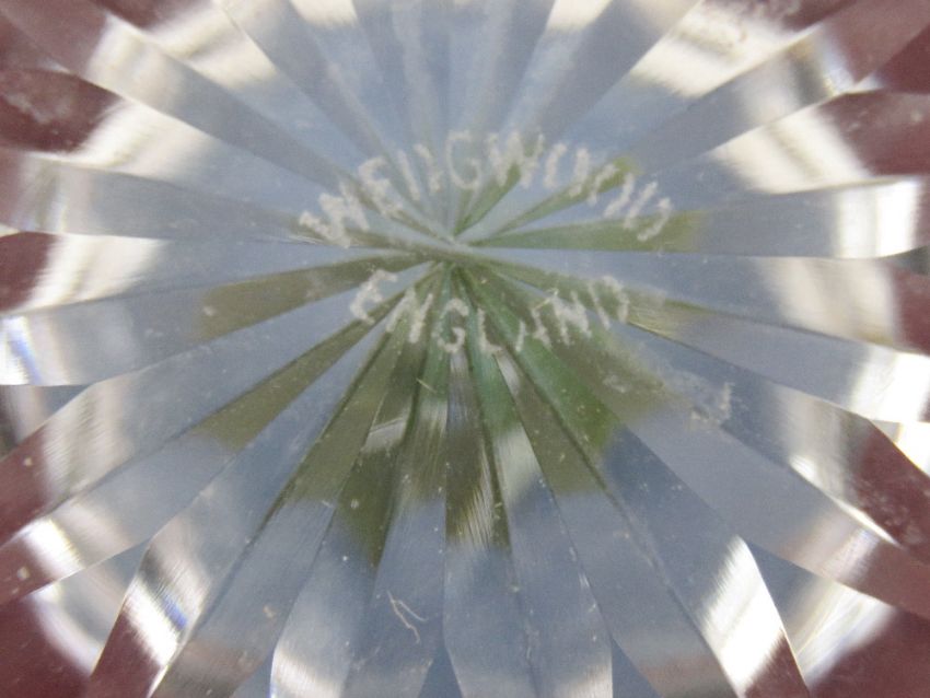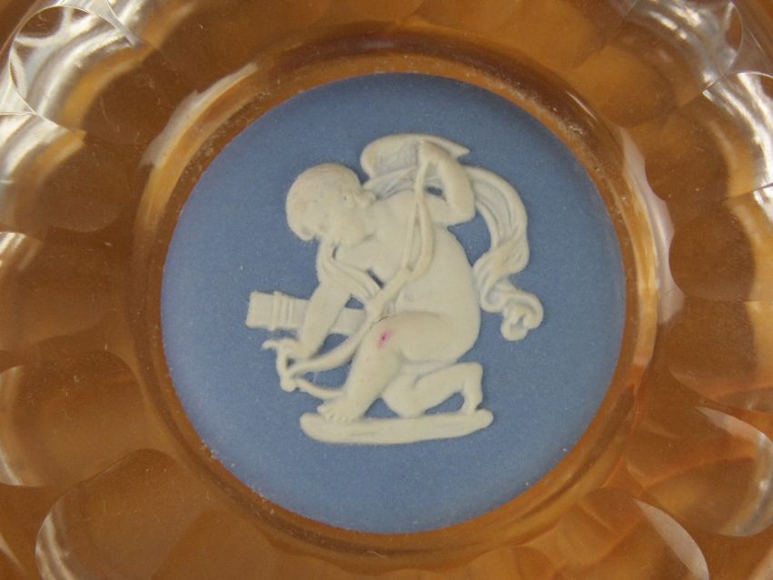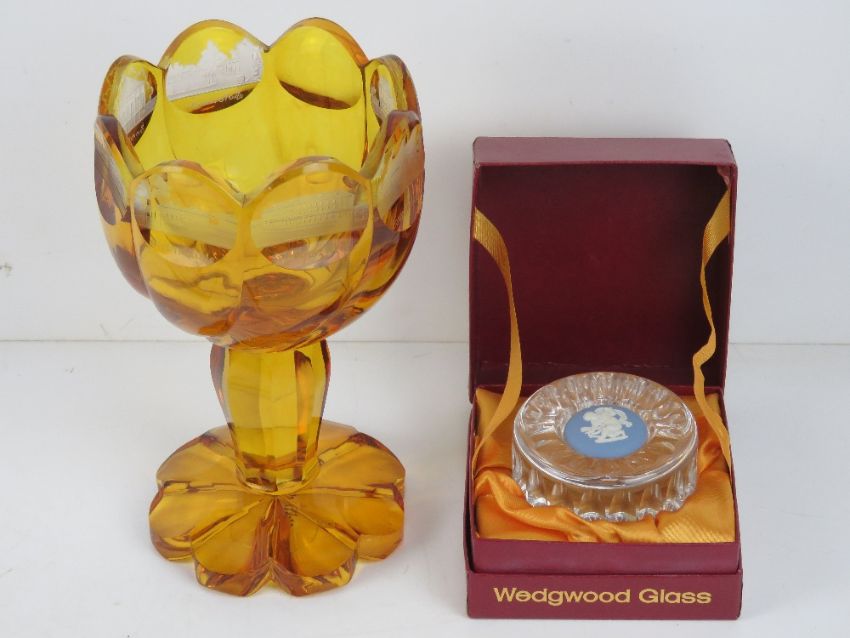 An amber glass goblet having etched German town upon, together with a Wedgwood paperweight in original box. Two items.
