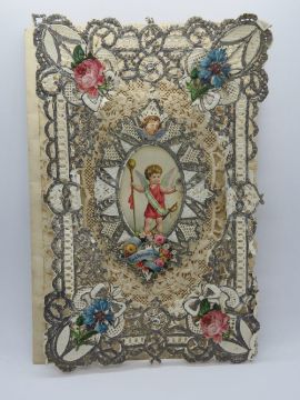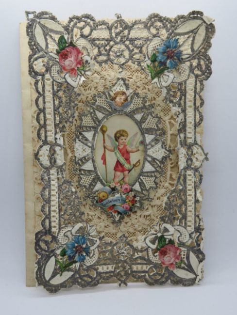 A decoupage Sweetheart or Valentines card having central cherubic design and entitled 'Loves Garland to thee' over paperlace with corner floral motifs, no message within, approx 18 x 12.5cm.