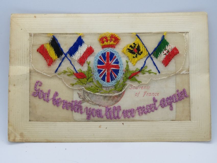 'God be with you till we meet again' embroidered WWI sweetheart greetings postcard, having souvenir from France card within and having handwritten message within ' From your loving friend Albert in France, 14 x 9cm.