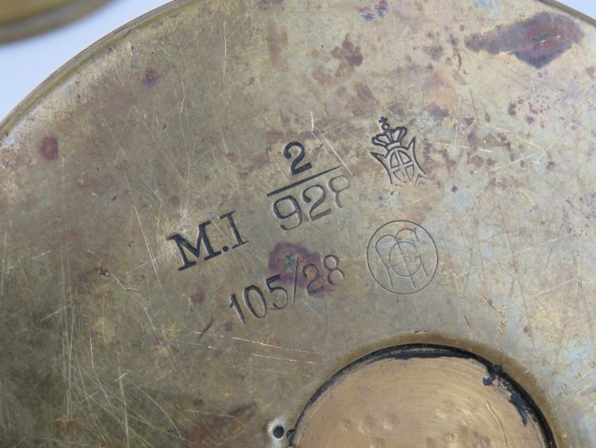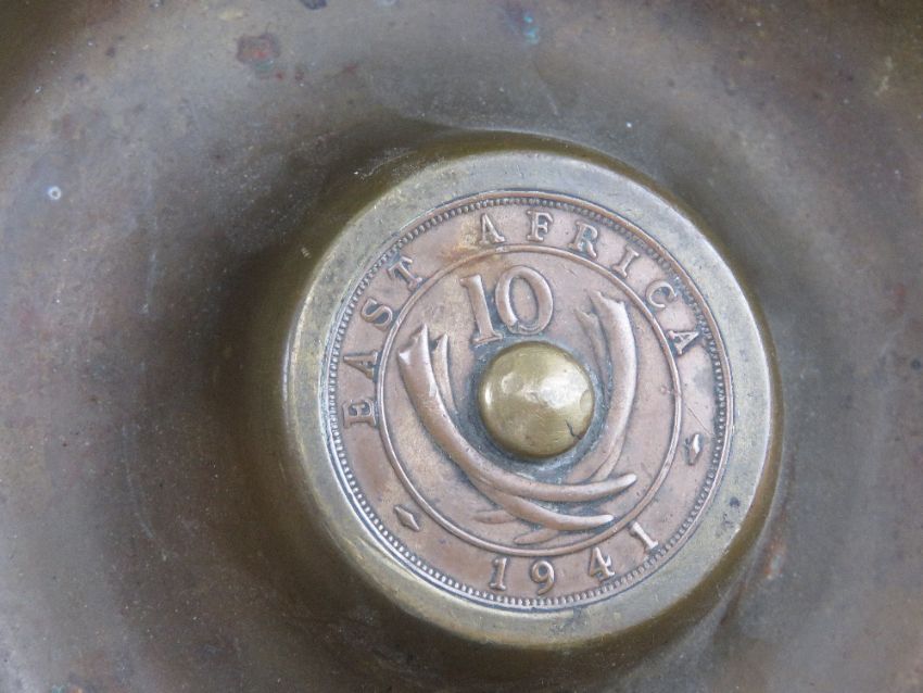A quantity of WWI and WWII trench art inc Canadian shell case dated 1916 having a 1 franc to the base dated 1918, a WWII brass ash tray, approx. 12cm in diameter, having an East Africa coin dated 1941 to the centre and a WWI British shell case, etc.