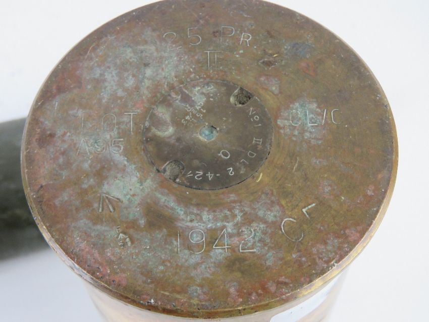 An inert WWII 25pdr shell and case standing 66.5cm high dated 1942 having broad arrow upon. Replica fuse.