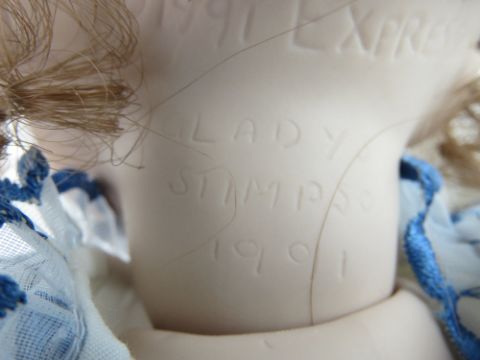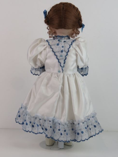 A handmade 20th century bisque headed doll made using an antique doll mould, having fine custom made outfit. In support frame, standing approx 47cm high.