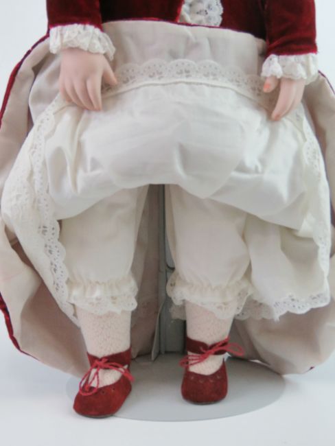 A handmade 20th century bisque headed doll made using an antique doll mould, having fine custom made outfit. In support frame, standing approx 67cm high.