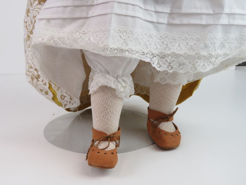 A handmade 20th century bisque headed doll made using an antique doll mould, having fine custom made outfit. In support frame, standing approx 73cm high.
