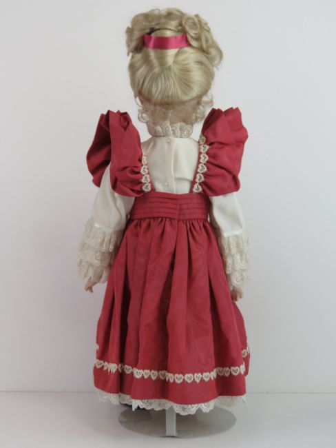A handmade 20th century bisque headed doll made using an antique doll mould, having fine custom made outfit. In support frame, standing approx 57cm high.