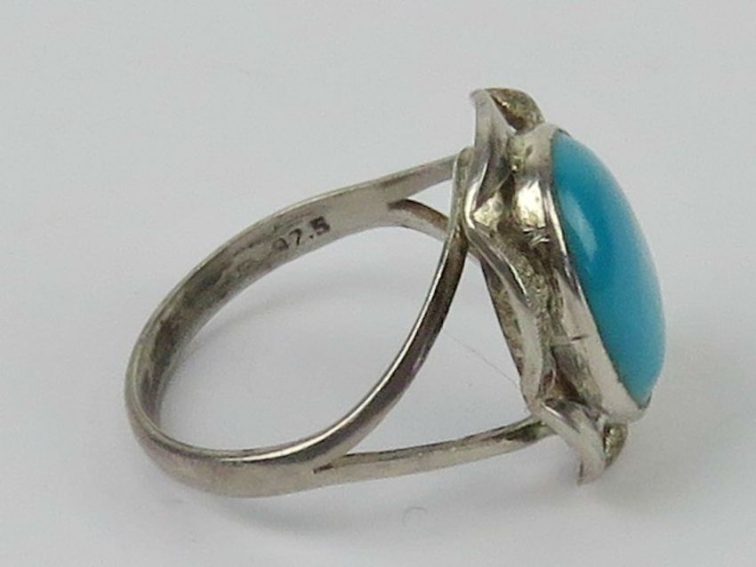 A silver and turquoise cocktail ring having brushed and polished pierced gallery around the oval cabachon, stamped 925, size P-Q.