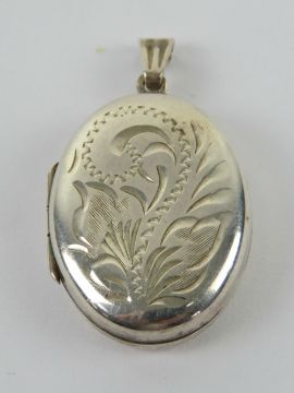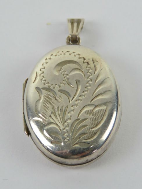 An oval silver HM locket having floral engraving to front, hallmarked for Birmingham, 3.5cm inc bale.