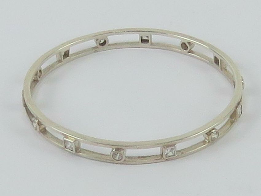 A hallmarked silver solid bangle having alternating square and round but white stones throughout, hallmarked for Birmingham, internal dia 5.4cm, 16.5g.
