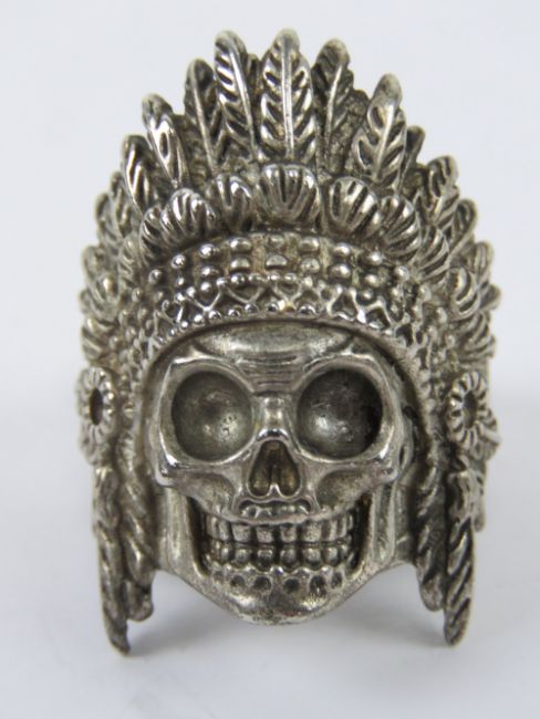 A white metal ring having skull in Native American style Chieftain feathered head dress, stamped 925, size U (slightly adjustable), 18.4g.
