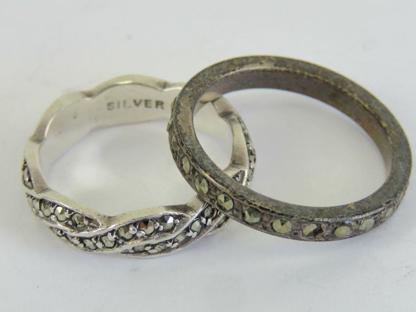 Two silver and marcasite rings, one being Sterling in plaited design size L, the other marked silver and being size N.