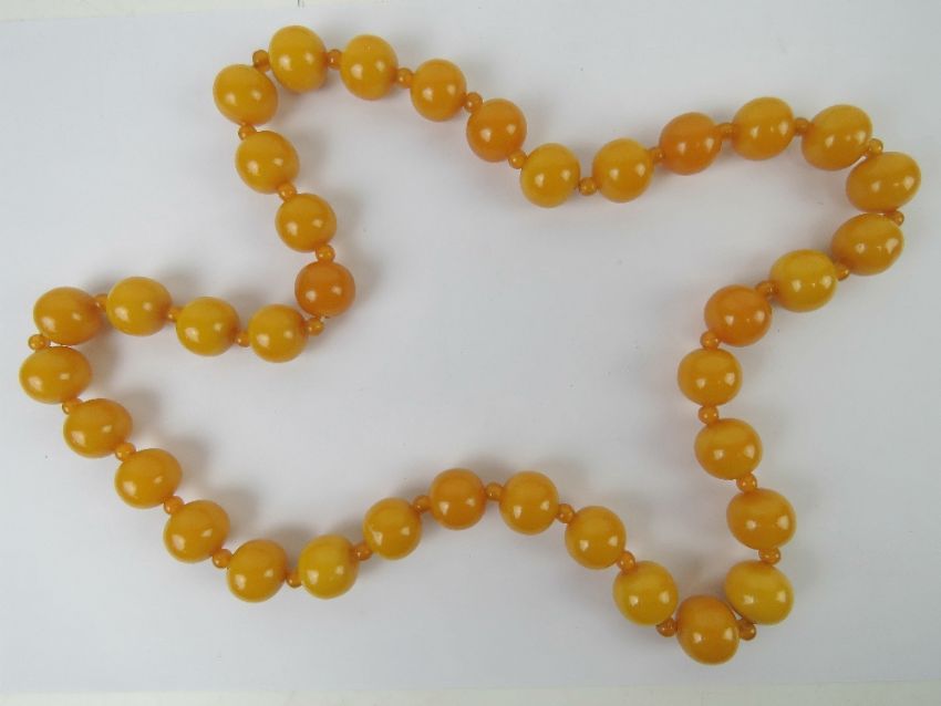 An Egg Yolk amber bead necklace, having alternating sized beads on double cord, largest approx 1.6cm dia, approx 76cm total length, 146.4g