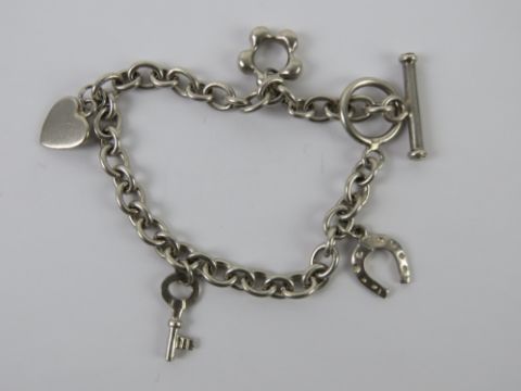 A HM silver charm bracelet having T-bar clasp and four charms upon being daisy, heart, key and horseshoe, hallmarked for Birmingham, 18.5cm in length, 19.7g.
