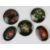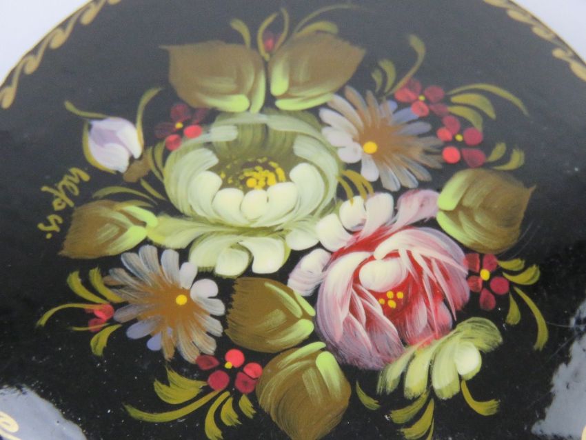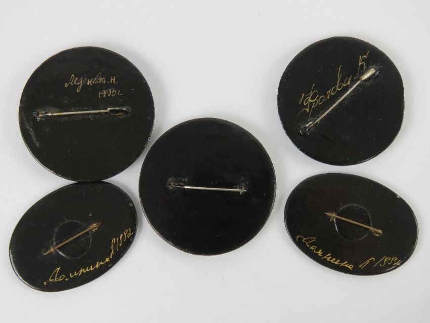 Five Russian papier mache hand painted floral brooches, four having artist signatures to back, one signed to front.