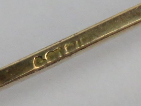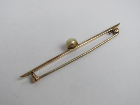 An Edwardian gold and pearl bar brooch, stamped 9ct? indistinct, 5.7cm wide, 2.2g