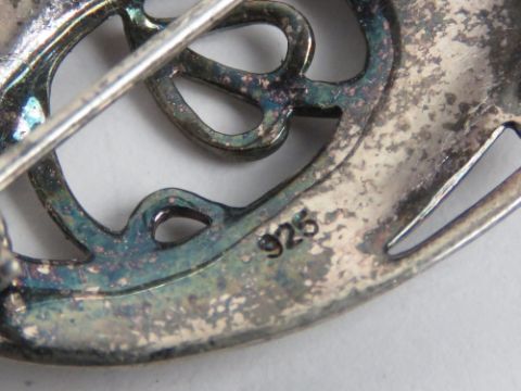 A HM silver brooch in abstract design, together with two brooches stamped 935 in the form of theatre masks and Rennie Mackintosh style flowers, a silver brooch with floral design and a white metal and marcasite bow brooch. Five items.