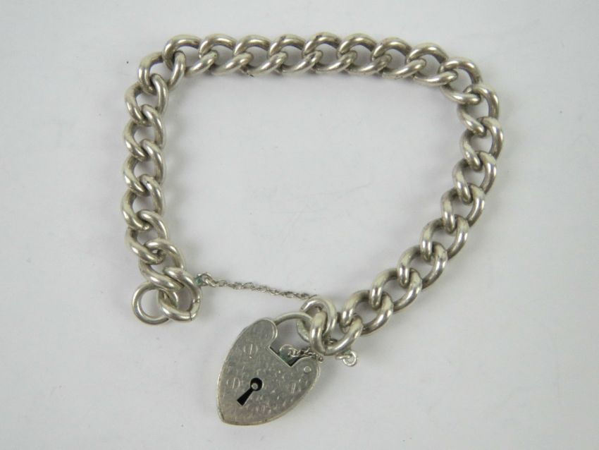 A heavy HM silver charm bracelet having heart padlock clasp, clasp stamped silver, chain having hallmarks throughout, 33.6g.