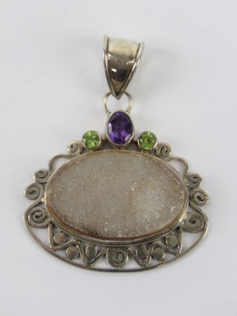 A HM silver and druzy agate pendant having peridot and amethyst stones upon, hallmarked 925, 4.4cm wide.