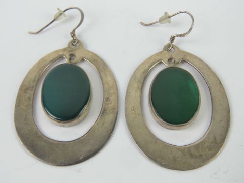 A pair of large green stone and silver earrings, stamped 925, drop from top of hook 5.5cm in length.