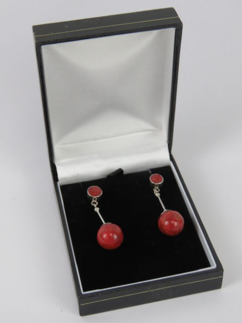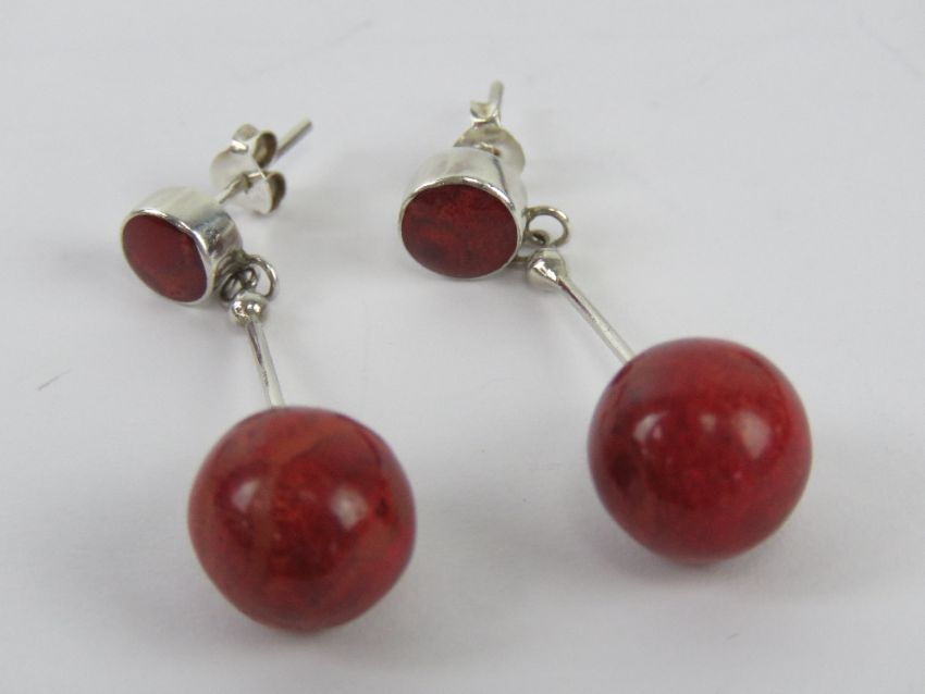 A pair of modern faux coral and silver earrings, stamped 925, with butterfly backs, in presentation box.
