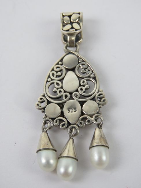 A silver pearl and mother of pearl pendant, stamped 925 and measuring 6.1cm in length.