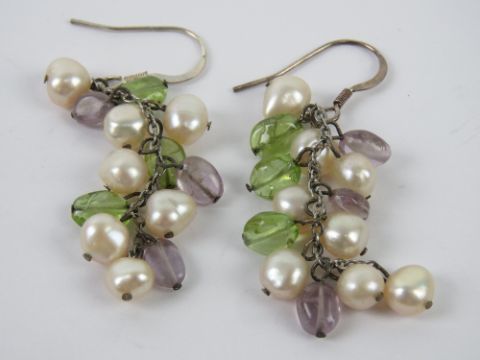 A pair of pearl and gemstone cluster earrings, no apparent hallmarks, 6cm drop.