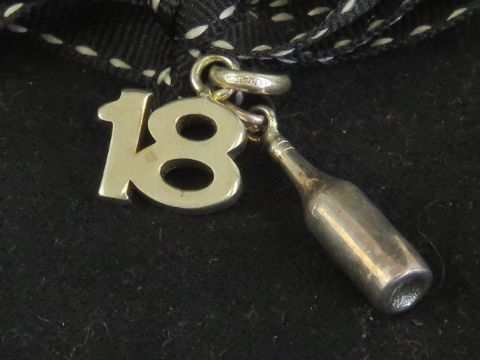 Links of London; two silver charms having Links hallmark upon in the form of an '18' and a champagne bottle. In presentation box.