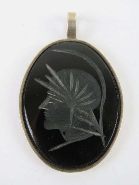 A large carved onyx pendant having warrior upon in HM silver frame, measuring 5.3cm inc bale, hallmarked for London.