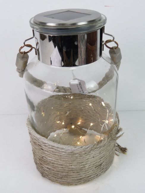 A contemporary 'storm lantern' having rope design on glass jar, solar panel untested, battery powered lights within.