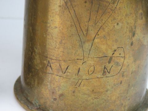 A WWI Trench art shell casing dated 1917, Approx. 23cm tall. Together with a WWII British 12PR inert shell casing, a WWI German 75mm Field gun inert shell, a WWI German Polte Magdeburg shell casing dated 1915 with trench art of a plant saying Avion and from France. Four items.
