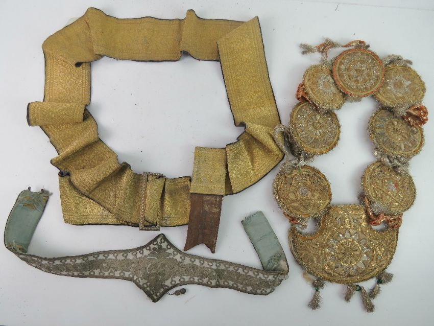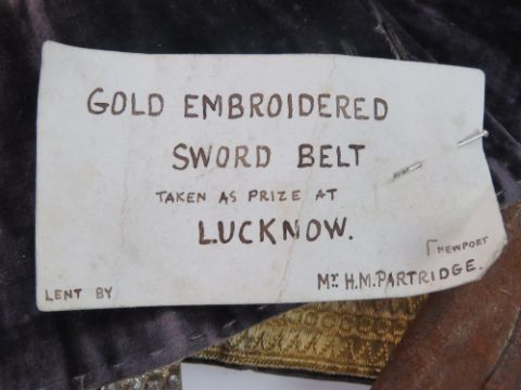 A 19th century gold embroidered sword belt having dark grey velvet backing and bearing museum / collection label 'Taken as a prize at Lucknow, lent by Mr H.M. Partridge'. Together with a 19th century powder blue silk and silver thread embroidered belt and a ceremonial gilt embroidered sash. Three items. Footnote; H.M. Partridge b. 1866 d. 1890 at Quetta in India. Captain Royal Engineers. Son of Samuel Bowen Partridge b.1823 d. 1898 Deputy Surgeon General - Bengal Army Medical Service and Companion of the Most Eminent Order of the Indian Empire. Copy biography of Samuel Bowen Partridge available on request.