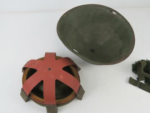 A British Military Turtle shell helmet with liner dated 1981. Together with a wooden transit case. Two items.