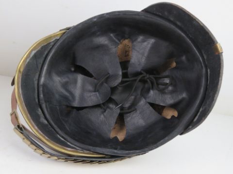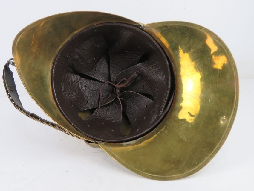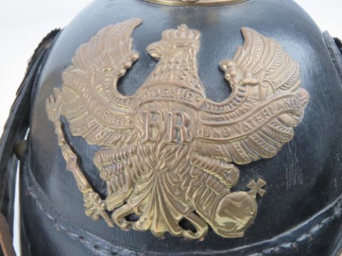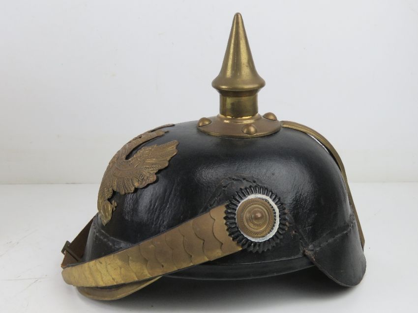 Reproduction items; a WWI German Pickelhaube helmet together with a brass Fireman's helmet.